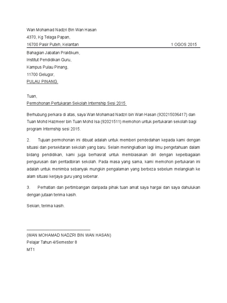Surat Tukar Sekolah Internship
