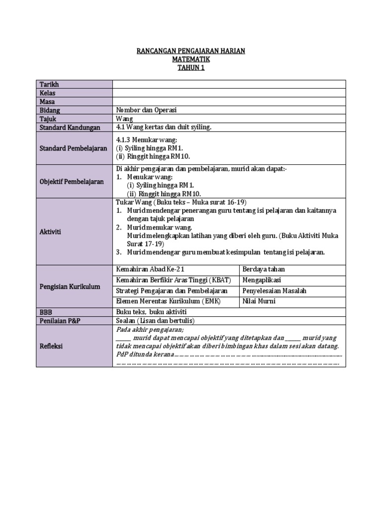 Template Rph Matematik Kssr Tahun 3 Wang